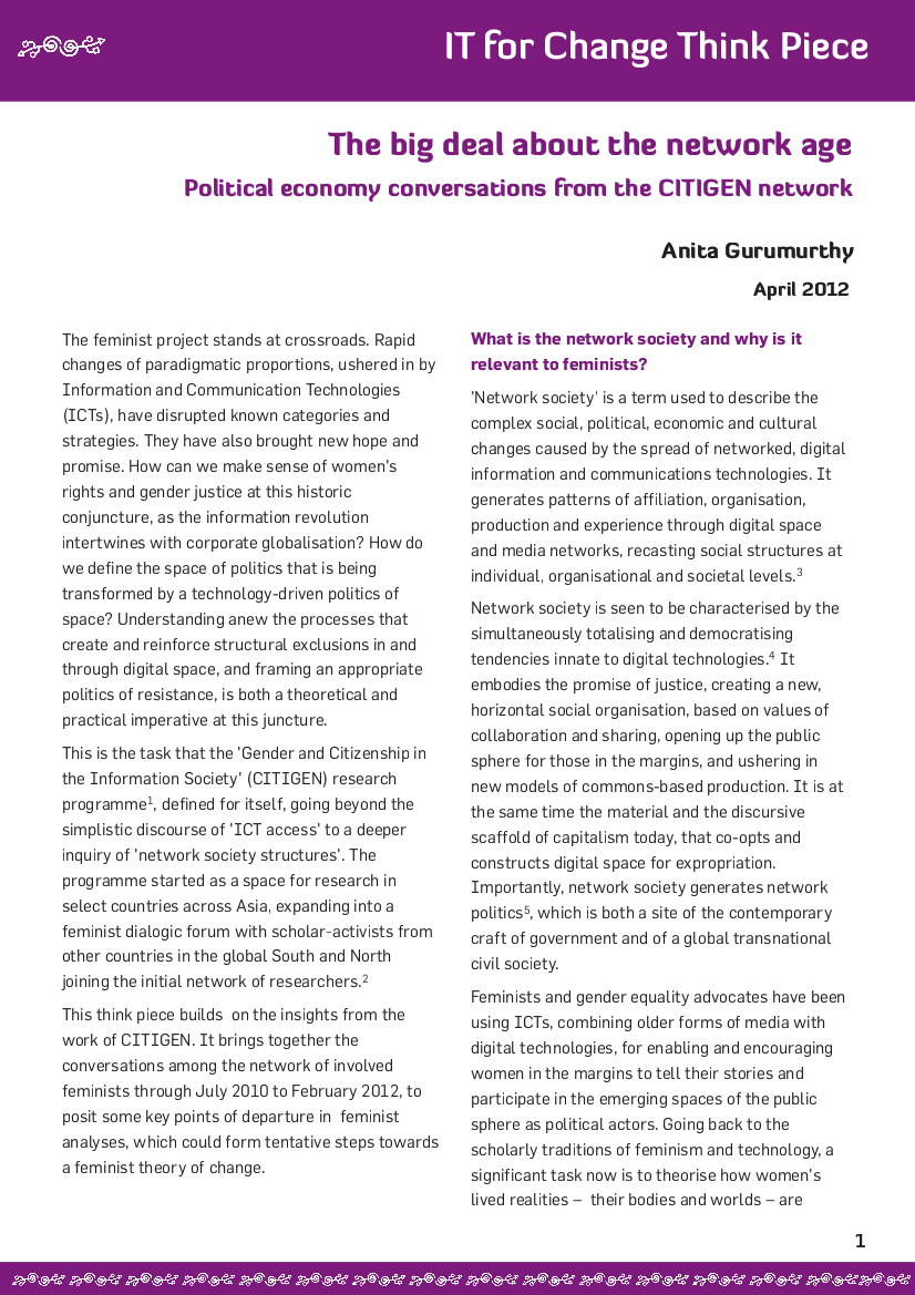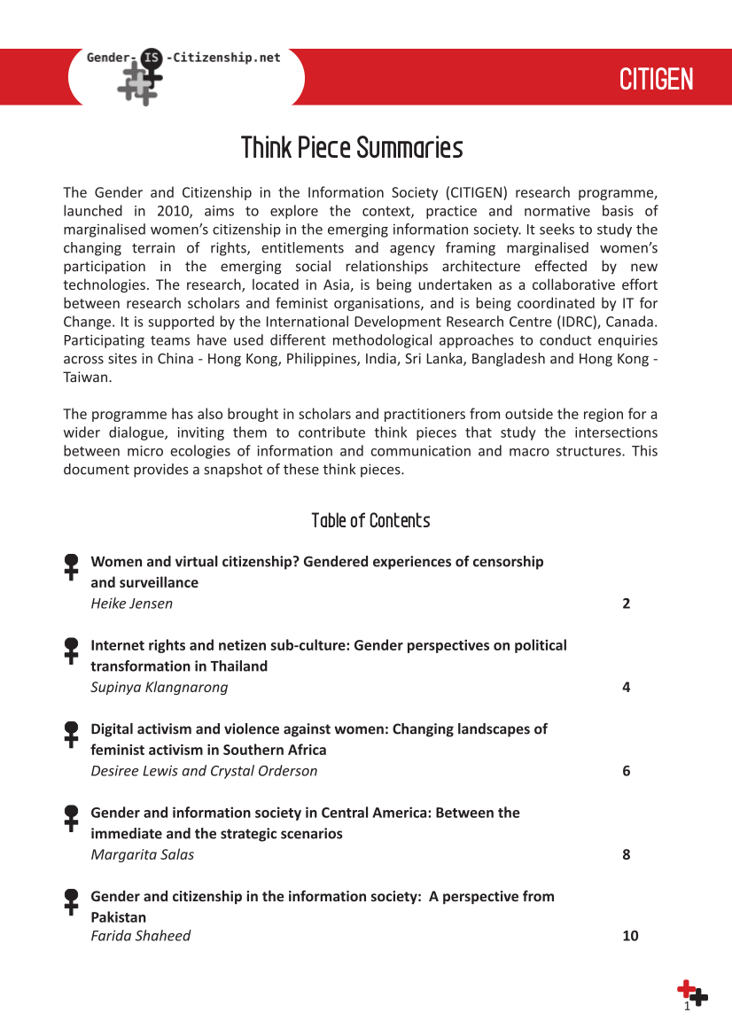 This think piece builds on the insights from the work of CITIGEN. It brings together the conversations among the network of involved feminists through July 2010 to February 2012, to posit some key points of departure in feminist analyses, which could form tentative steps towards a feminist theory of change.